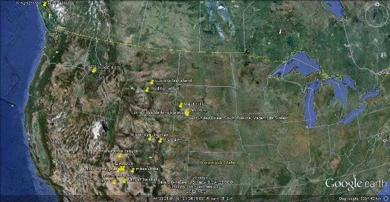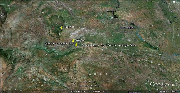 centraal, de punaises maken het makkelijk zoeken, op de kaart hierboven zit de meest rechtse punaise op de plek waar Wounded Knee is: South Dakota, daaronder Nebraska, links ervan Wyoming, daaronder Colorado. Boven South Dakota ligt North Dakota, ten westen daarvan ligt Montana.