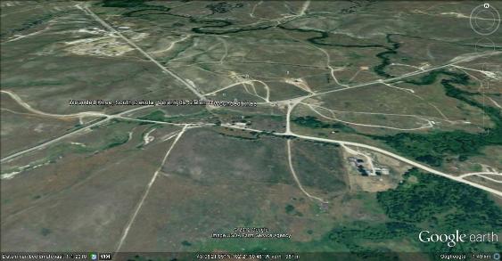 centraal op de foto, boven de weg die van rechtsboven naar midden links kronkelt is de begraafplaats met het massagraf. Linksboven ligt het plaatsje Wounded Knee.