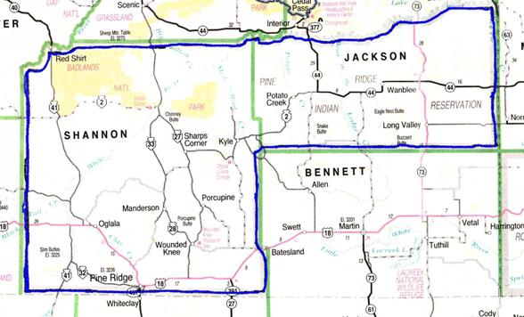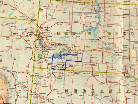 kaart overzicht usa, blauwe stip boven en blauw omlijnd beneden is Pine Ridge op de grens van South Dakota en Nebraska