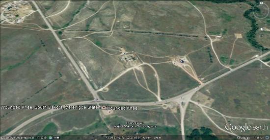 centraal op de foto, boven de weg die van rechtsboven naar midden links kronkelt is de begraafplaats met het massagraf. Linksboven ligt het plaatsje Wounded Knee.